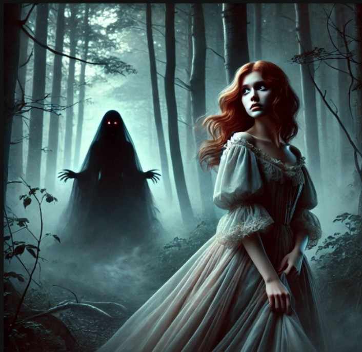 As she wandered through the forest, lost in thought, a cold shiver ran down her spine. She stopped, looking around. The air had shifted, the silence becoming oppressive. She felt as though she were being watched.